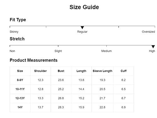 आकार चार्ट: 8-9Y: शोल्डर: 12.3", बस्ट: 23.6", लंबाई: 13.6", आस्तीन की लंबाई: 19.3", कफ: 6.2", / 10-11Y: शोल्डर: 12.8", बस्ट: 25.2", लंबाई: 14.4", बांह की लंबाई: 20.5", कफ: 6.5", / 12-13Y: कंधा: 13.3", छाती: 26.8", लंबाई: 15.2", आस्तीन की लंबाई: 21.7", कफ: 6.7", / 14Y: कंधा: 13.7", बस्ट: 28.3", लंबाई: 15.9", बांह की लंबाई: 22.8", कफ: 6.9"